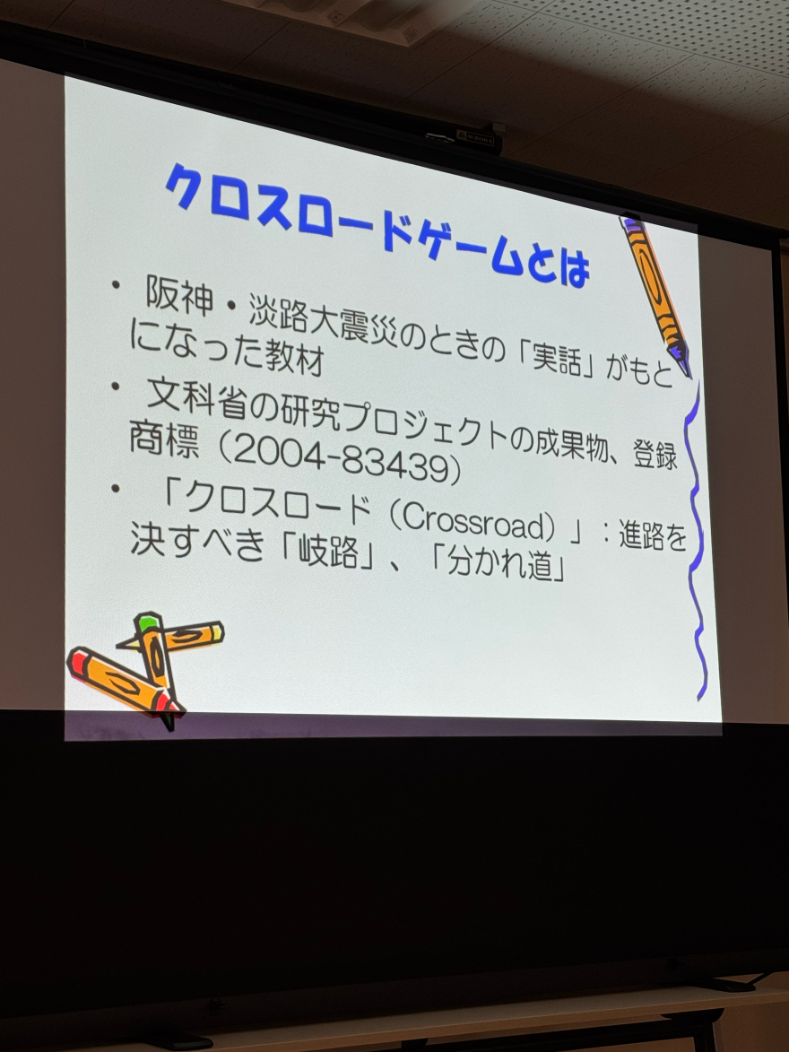 クロスロードゲームとは、阪神・淡路大震災の時の「実話」がもとになった教材で、ゲーム感覚で災害時の対策を疑似体験学習する、というものです。